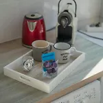 Oteldeki misafir odalarında kahve makinesi, yemek alanı, dolap gibi olanaklar sunulur.